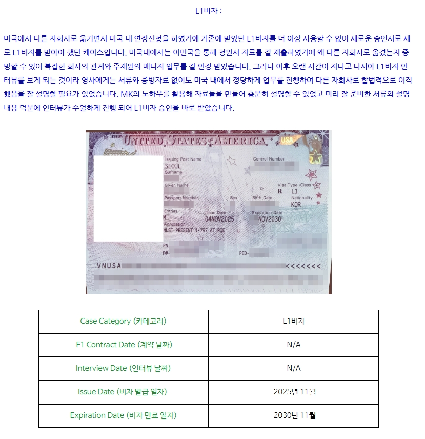 L1비자 : 미국 내 다른 자회사로 옮기면서 주재원비자를 다시 받은 케이스