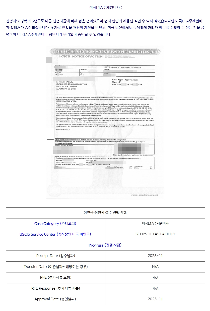 미국L1A주재원비자 : 신청자의 경력이 짧고 현지직원 수도 적었으나 청원서 승인