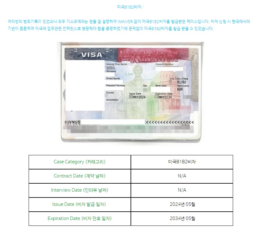 미국B1B2비자 : 범죄기록이 있었으나 WAIVER 없이 10년짜리 비자 발급받은 케이스