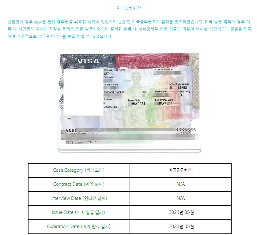 미국관광비자 : NIW 영주권 취득 이력이 있었으나 B비자 승인