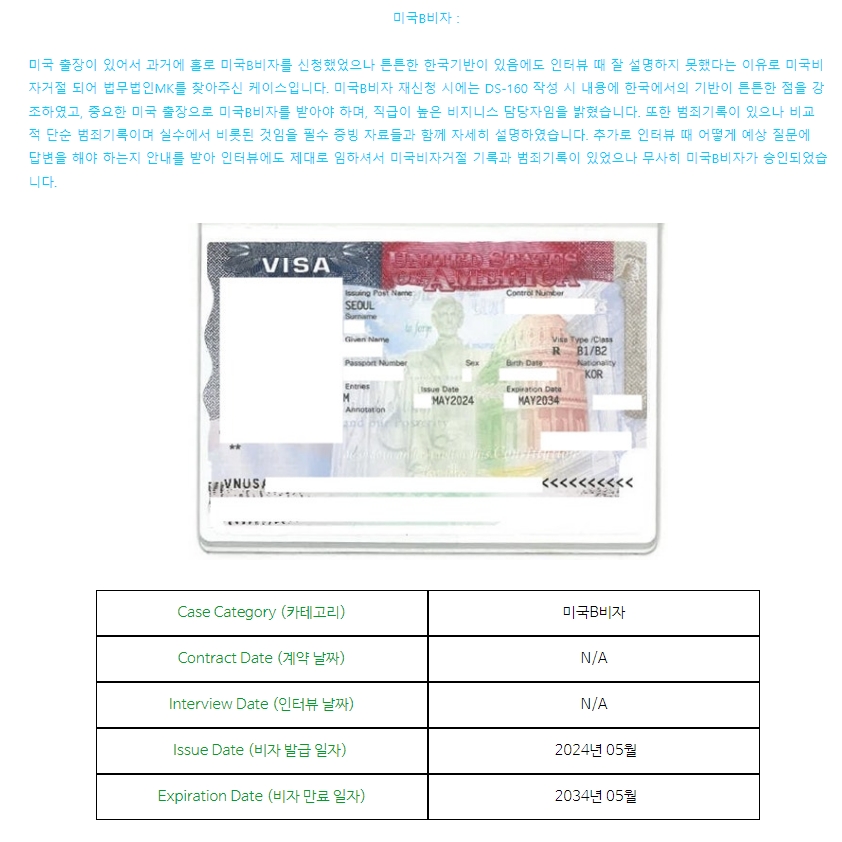 미국B비자 : 범죄기록과 미국비자거절 기록이있었으나 비자 승인