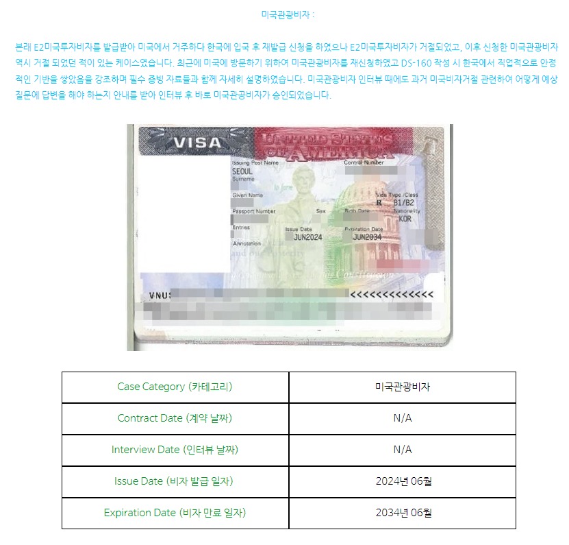 E2미국투자비자 거절 및 B비자 거절 기록이 있었으나 단순방문사유로 비자승인