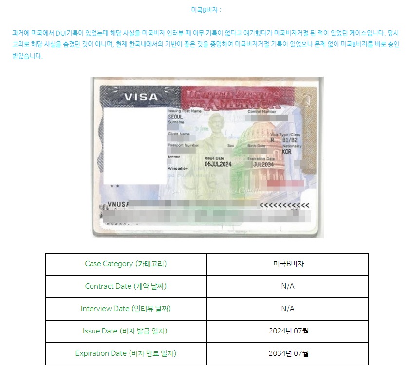 미국 내 음주운전 기록을 숨겨 미국비자거절 되었으나 출장으로 B비자 발급 성공