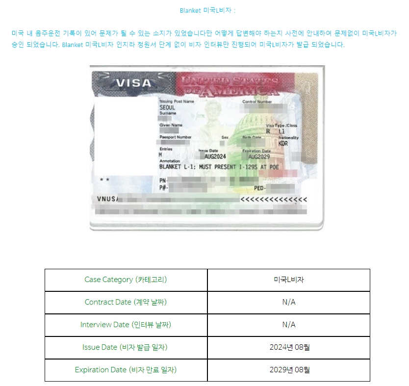 Blanket 미국L비자 : 미국내 음주운전 기록이 있었으나 인터뷰만 보고 미국L1비자 발급