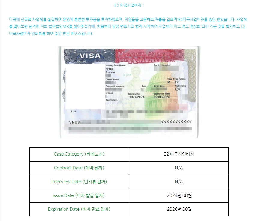 E2 미국사업비자 : 신규사업체를 운영하여 개인자격으로 투자비자 받은 케이스