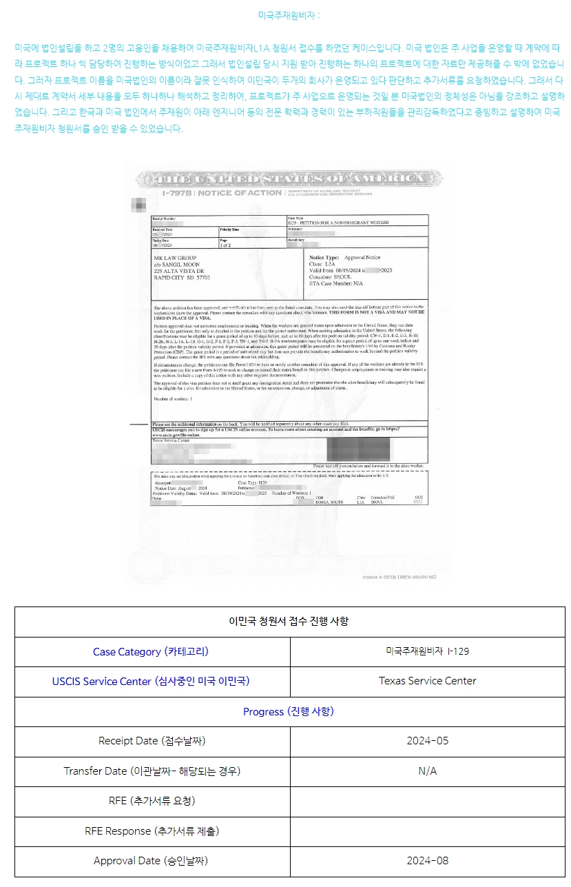 미국주재원비자 : 신규법인 파견 건으로, 서류 준비가 까다롭고 거절위험이 있었으나 청원서 승인