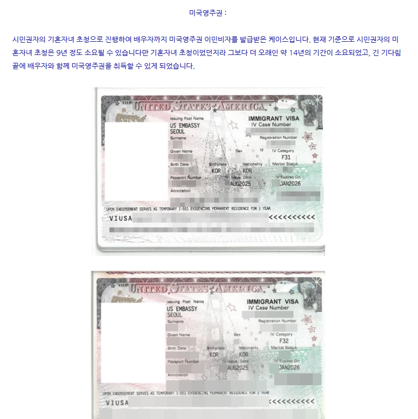 미국영주권 : 시민권자의 기혼자녀 초청으로 배우자까지 이민비자 받은 케이스