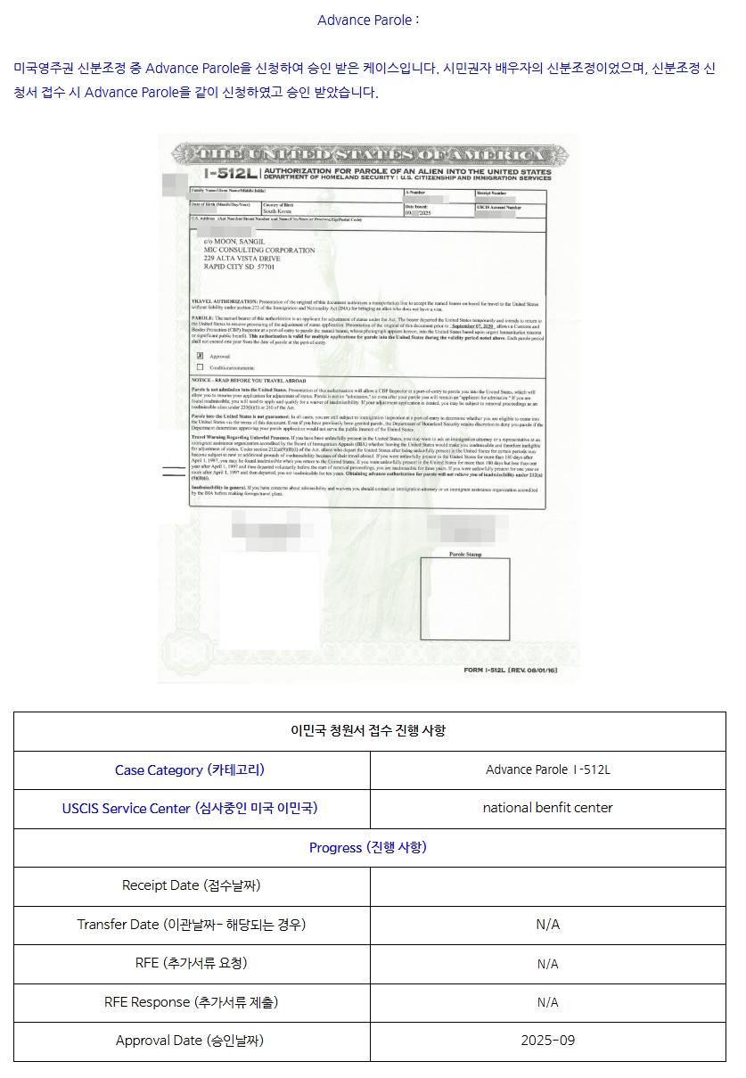 미국영주권 신분조정 중 한국귀국을 위해 Advance Parole 승인받은 케이스