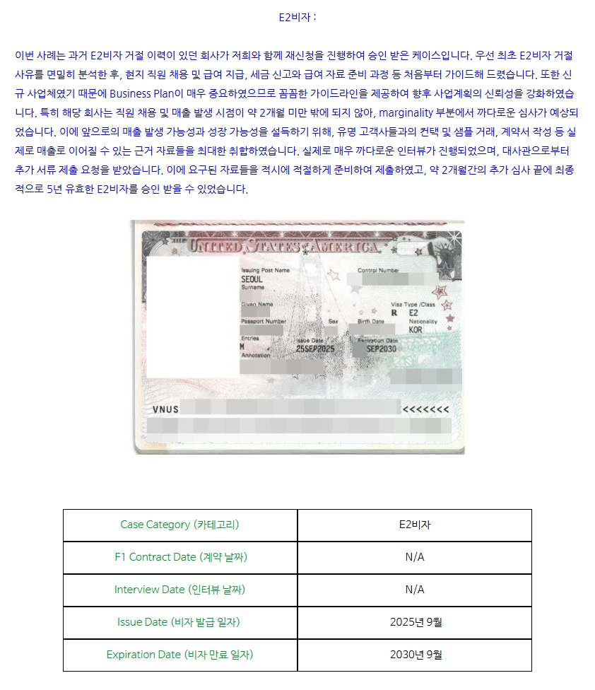 E2비자: 신규사업체였고, 과거 E비자 거절기록도 있었으나 비자발급 성공