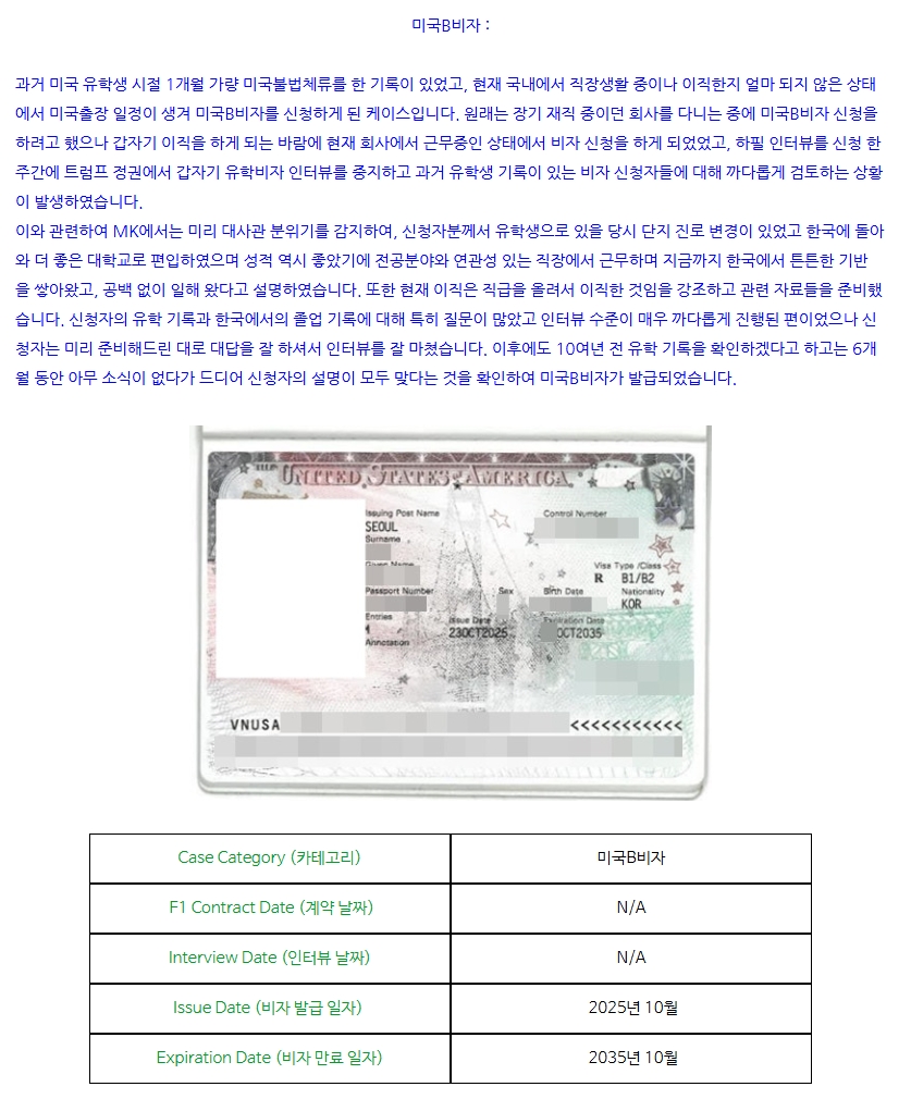 미국B비자 : 미국불법체류 기록이 있고 현직장 근무경력이 짧았으나 출장비자 발급
