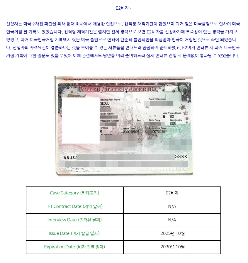 E2비자 : 재직기간이 짧고 과거 미국입국거절 기록도 있었으나 비자 발급