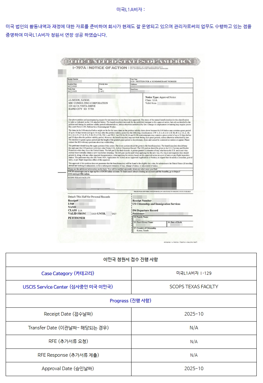 미국L1A비자 : 미국법인의 활동내역 및 재정자료를 준비하여 청원서 연장 성공