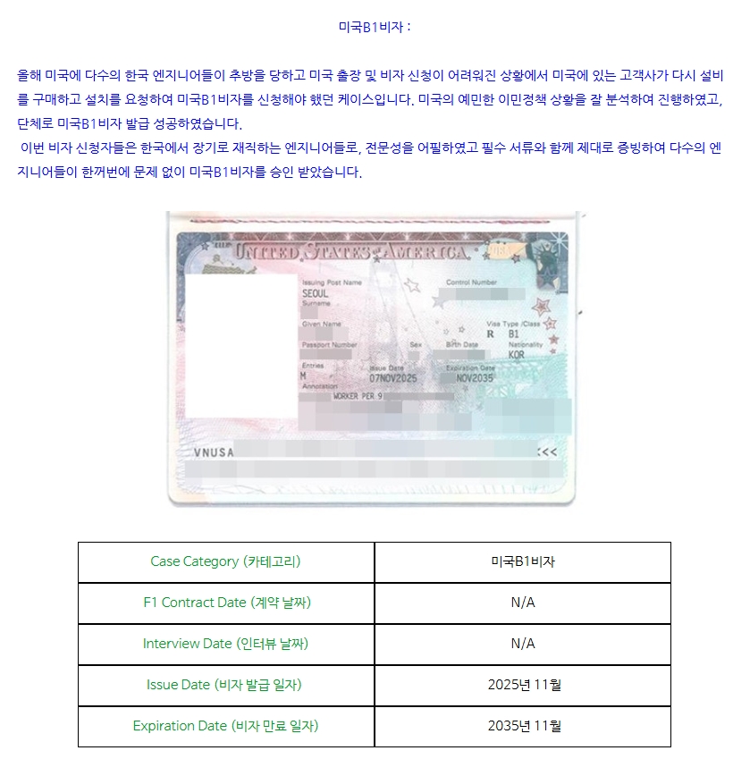 미국B1비자 : 설치업무를 위해 엔지니어분들이 단체로 출장비자 승인