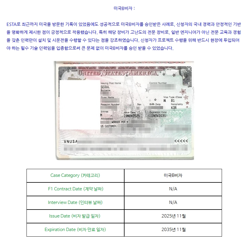 미국B1비자 : ESTA 취소기록이 있었음에도 설치 엔지니어로 단...