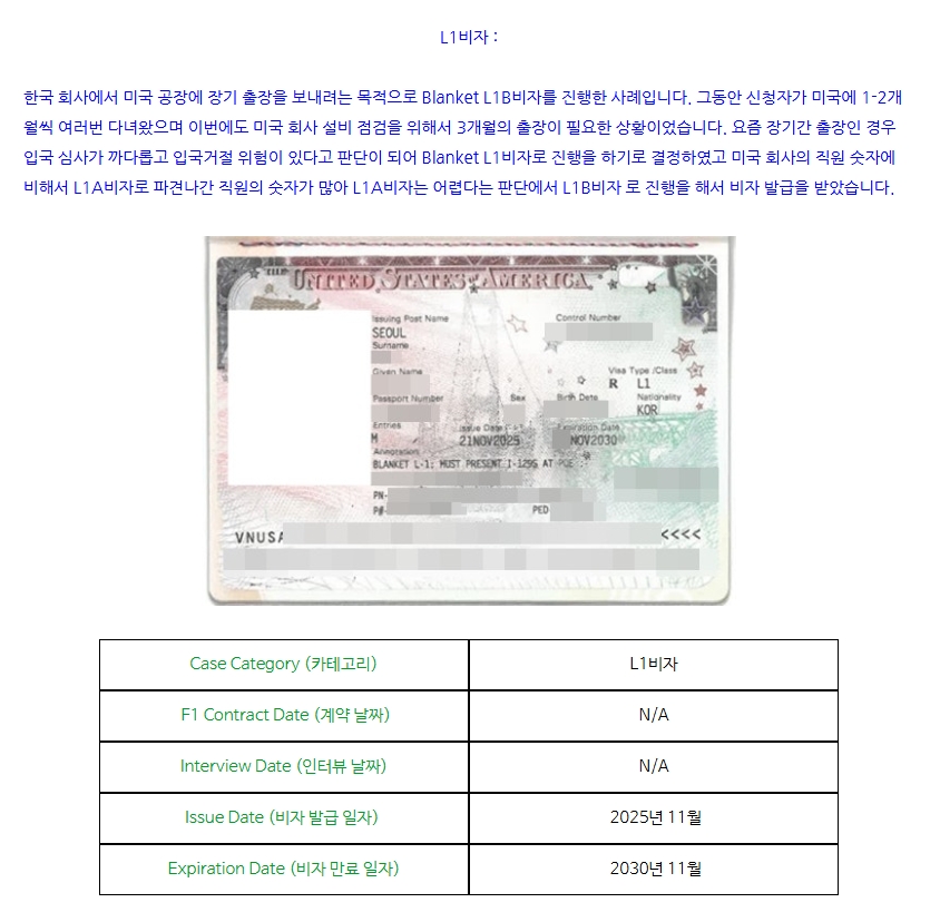 L1비자 : 공장 장기출장 목적으로 미국주재원비자 발급받은 케이스