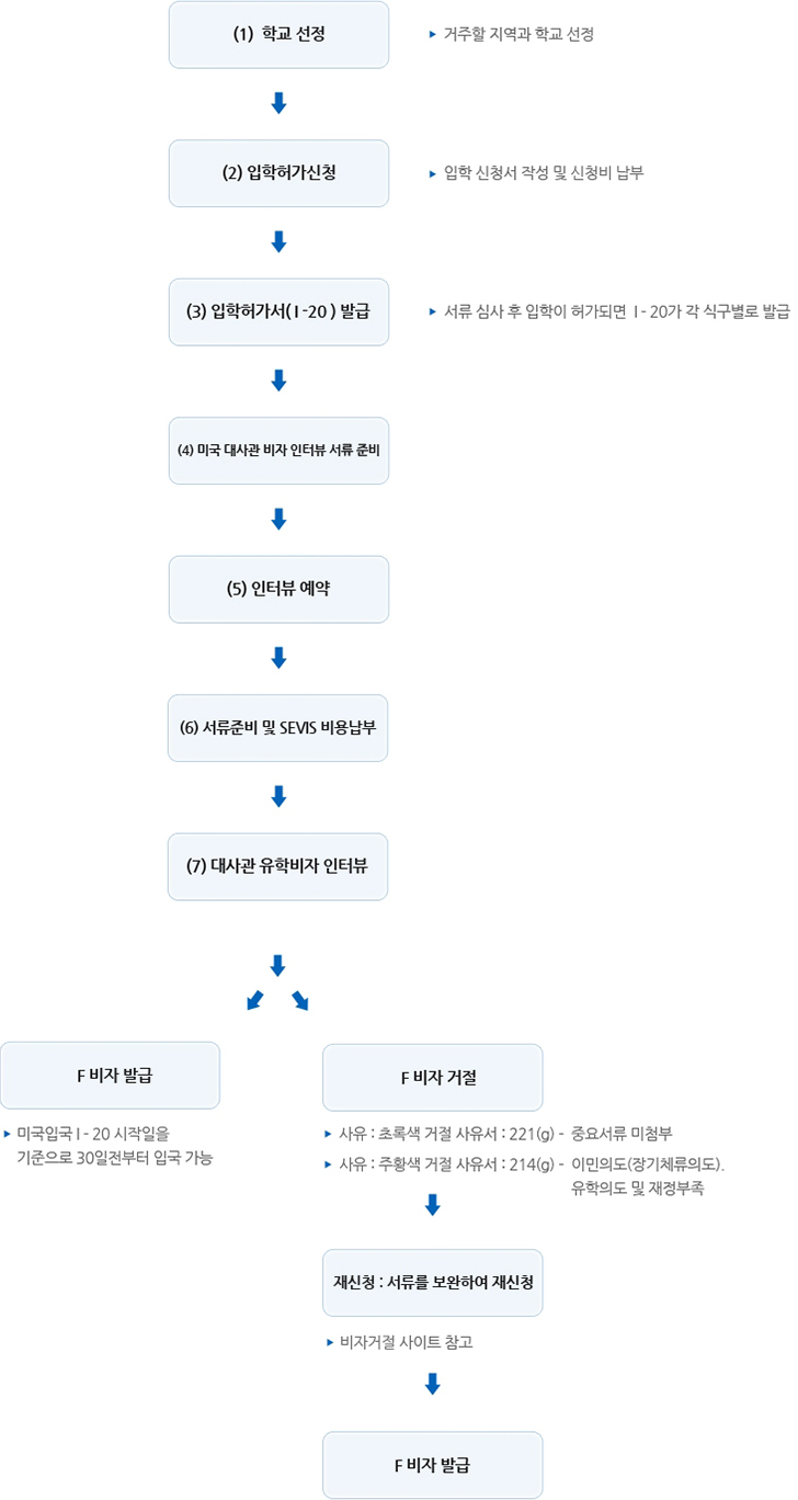 - 입학허가서 (I-20) 필요: I-20 발급이 가능한 학교에 등록 하여야만 유학비자 신청 가능